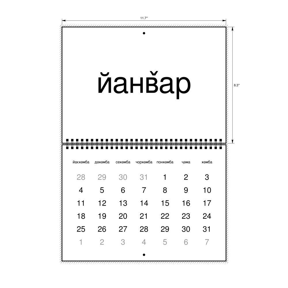 - Linguistics enthusiasts and polyglots - For "language geeks" interested in comparative linguistics or the mechanics of different languages and who value the aesthetic differences in scripts, orthography, and typography of different languages, the Yazghulami calendar serves as an object of intellectual interest. You can collect calendars for various languages to compare their linguistic roots (e.g., comparing Romance languages vs. Slavic languages). Leskoff's calendars are characterized by specific typographic choices that highlight the orthography and script unique to the target language. Think correct usage of diacritics, characters, and directional writing (left-to-right vs. right-to-left). The minimalist design focuses on legibility and aesthetic appeal of the script itself.