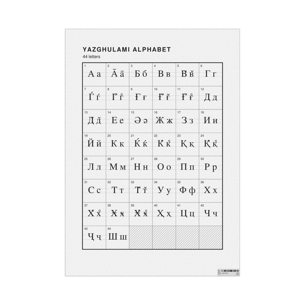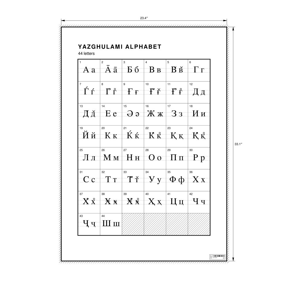 The Yazghulami alphabet chart (the full set of letters) in the 23.4 x 33.1 in (59.4 x 84.1 cm, poster / wall chart) format.