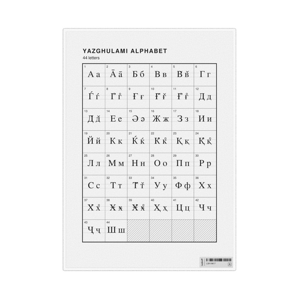 The Yazghulami alphabet chart (the full set of letters) in the 8.3 x 11.7 in (21.0 x 29.7 cm, desk chart, laminated) format.