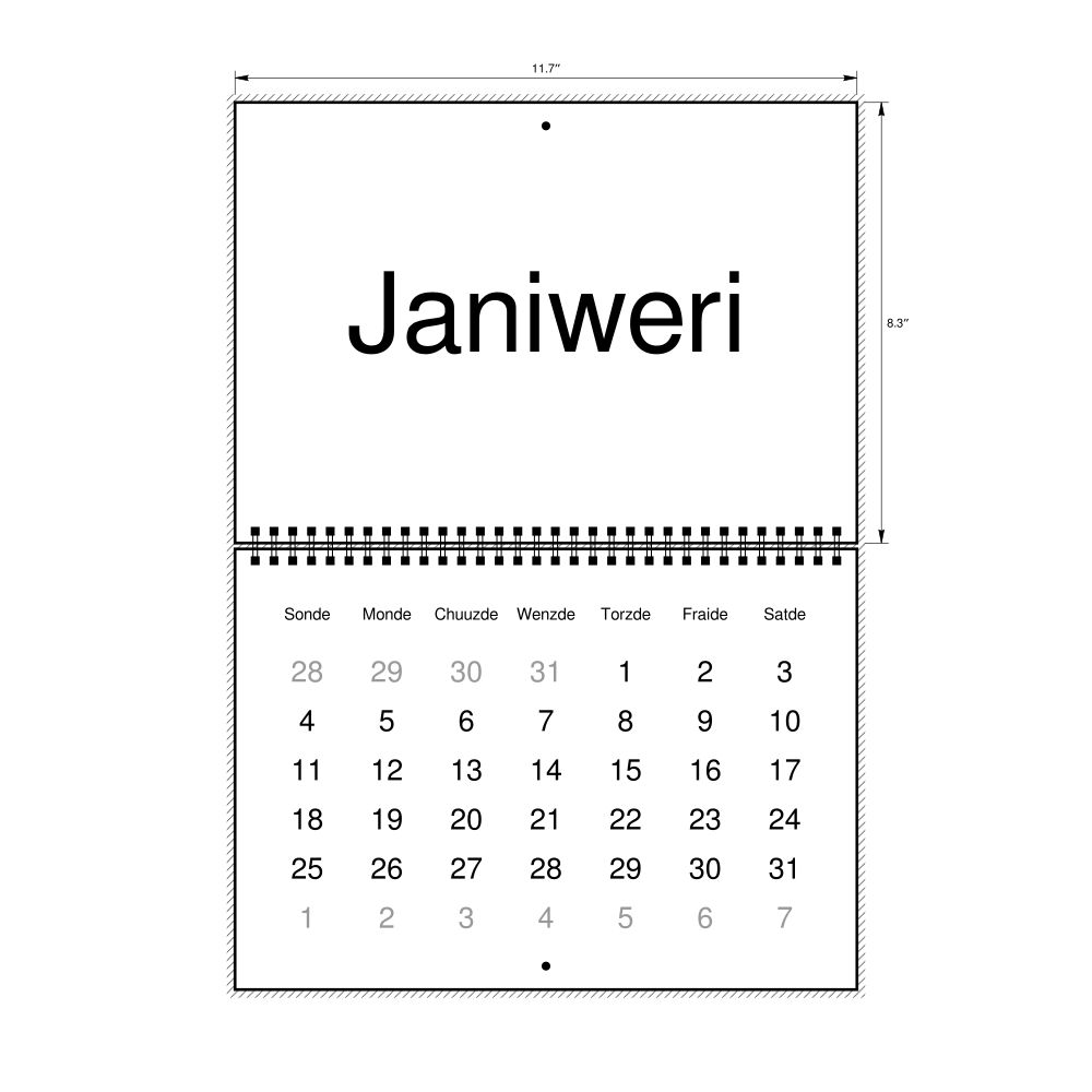 This calendar features the Jamaican Patois names of months and days of the week on top of a standard Gregorian calendar layout. Beyond its utility for tracking dates, it serves as an educational tool, cultural touchstone (cultural artifact), and functional decor (aesthetic object).