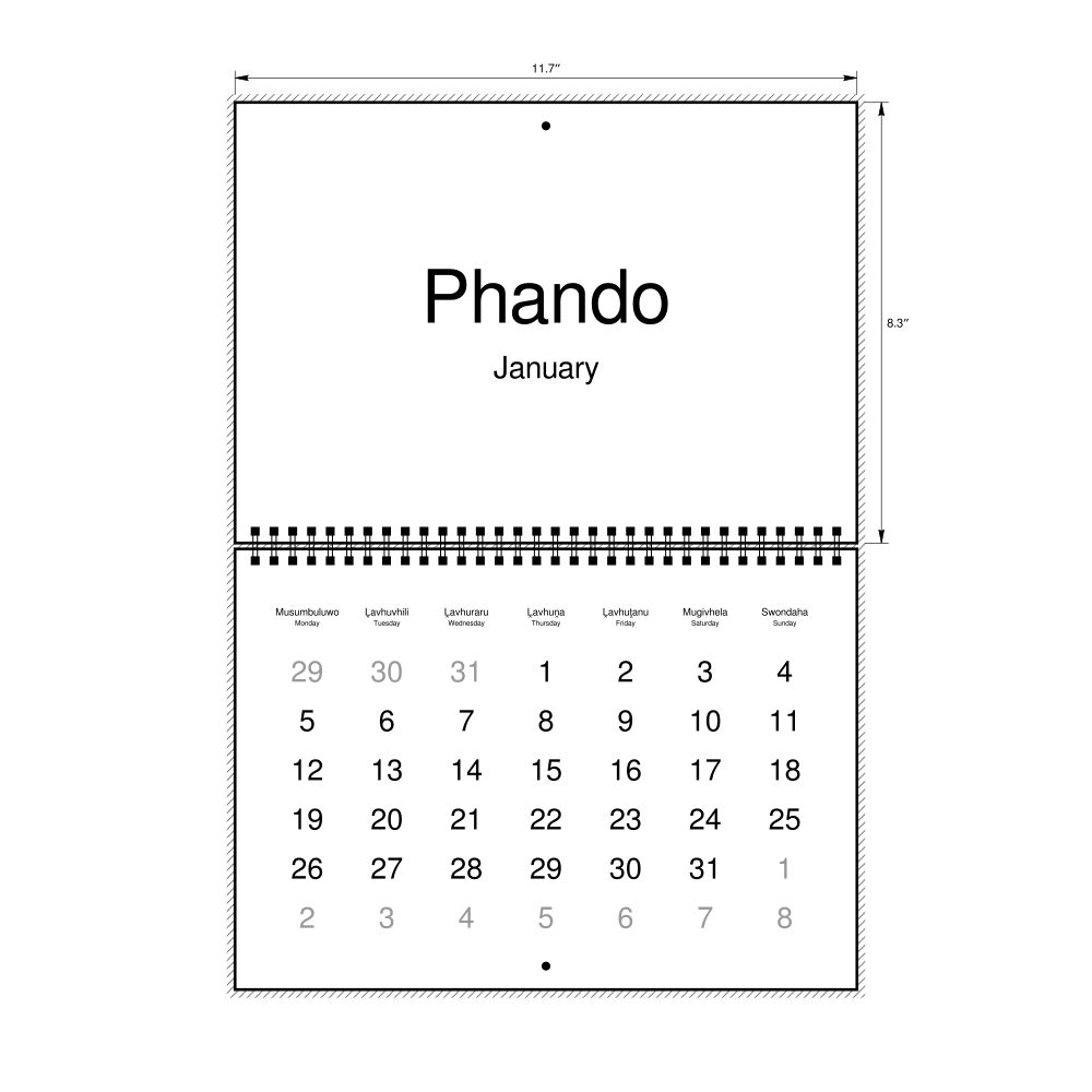 2026 Wall Calendar, Venda/English-Labeled, Sunday-Start Layout, Wire-Bound, 11.7 x 8.3 in (29.7 x 21.0 cm)
