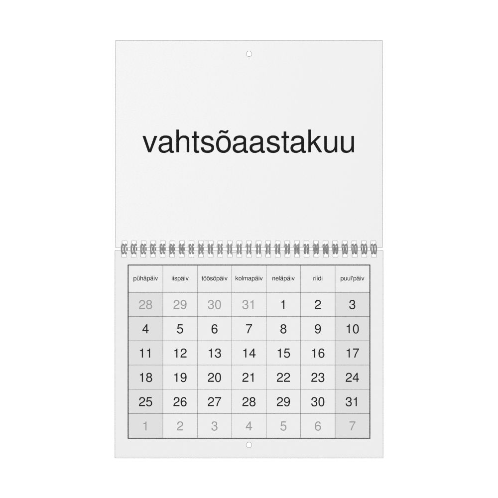 • Võro heritage speakers and cultural connectors - For individuals seeking to maintain a connection to their history, ancestral roots, or the culture associated with the Võro language, the calendar serves as a daily cultural marker. Use it in your home, office, library, or museum as a link to linguistic and cultural identity that integrates Võro into your everyday life. Familiar language script and naming conventions may also provide a sense of home in a foreign environment.