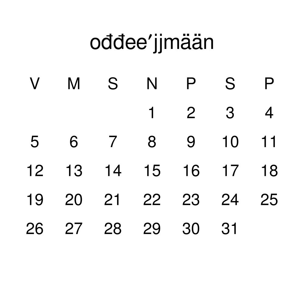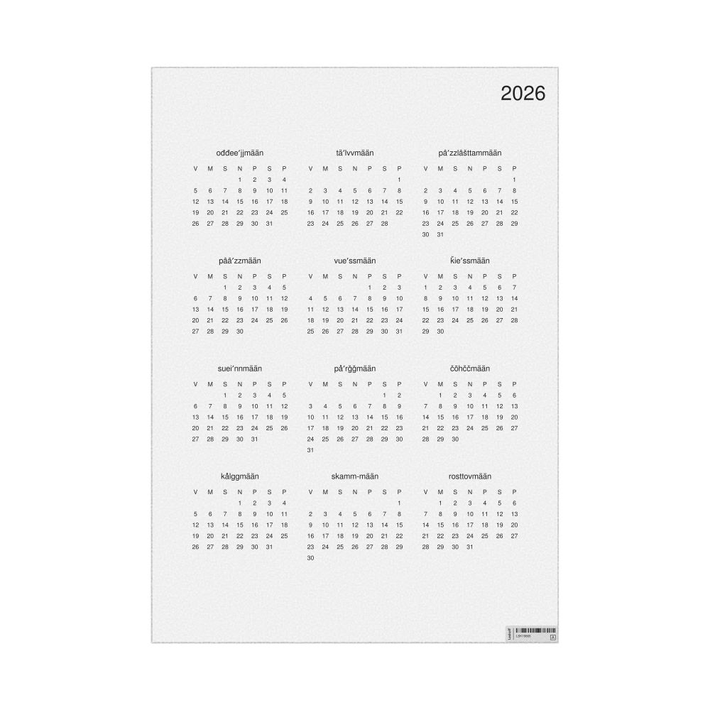 This calendar features the Skolt Sámi names of months and days of the week on top of a standard Gregorian calendar layout. Beyond its utility for tracking dates, it serves as an educational tool, cultural touchstone (cultural artifact), and functional decor (aesthetic object).