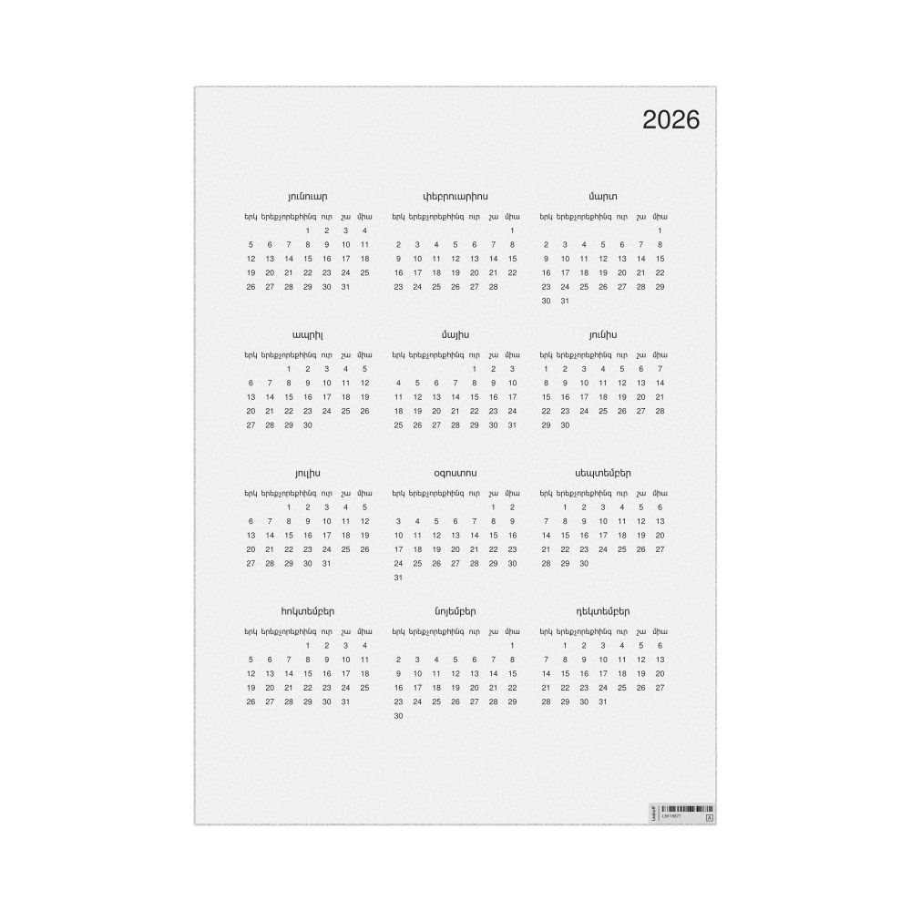 This calendar features the names of months and days of the week in Classical Armenian on top of a modern, standard Gregorian calendar layout. Beyond its utility for tracking dates, it serves as an educational tool and functional decor (aesthetic object).