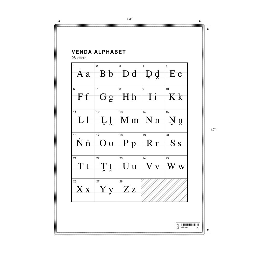 The Venda alphabet chart (the full set of letters) in the 8.3 x 11.7 in (21.0 x 29.7 cm, desk chart, laminated) format.