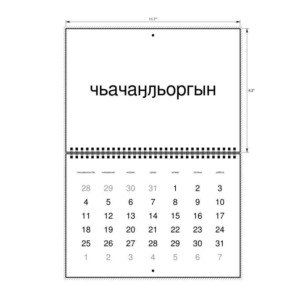 This calendar features the Chukchi names of months and days of the week on top of a standard Gregorian calendar layout. Beyond its utility for tracking dates, it serves as an educational tool, cultural touchstone (cultural artifact), and functional decor (aesthetic object).