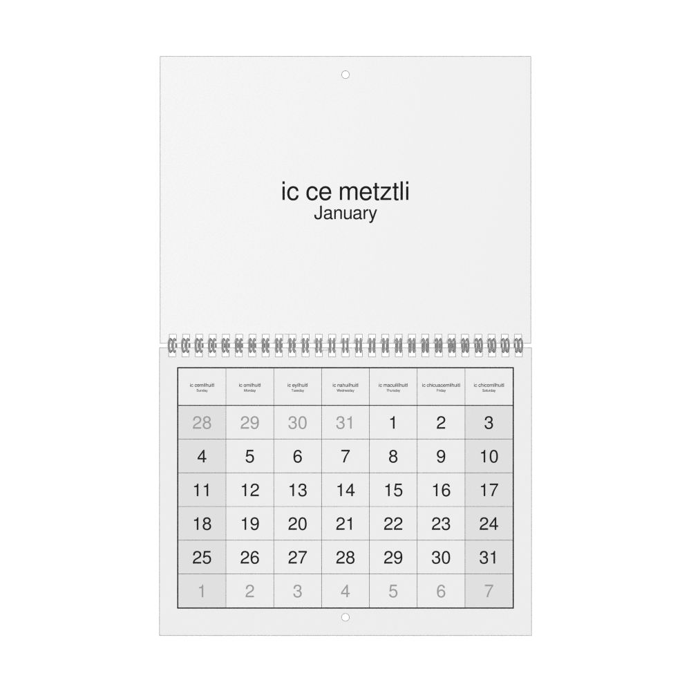 - Polyglots and autodidacts - For "language geeks" interested in the origins of different languages, classical literature, and scholarly pursuits and who value the typographic and aesthetic details of historical languages, the Classical Nahuatl calendar serves as an object of intellectual interest. You can collect calendars for various languages to compare their linguistic roots. The minimalist design focuses on legibility and aesthetic appeal of the historic and reconstructed words themselves.