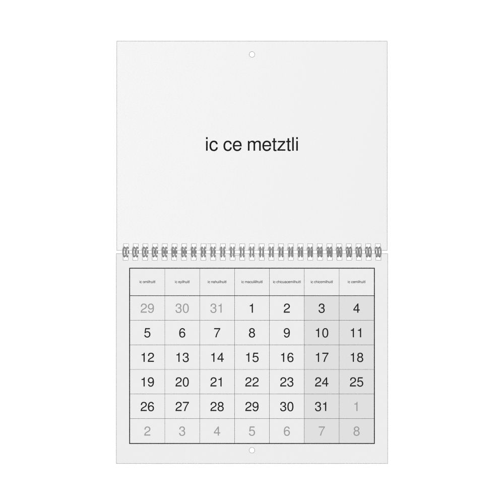 This calendar features the names of months and days of the week in Classical Nahuatl on top of a modern, standard Gregorian calendar layout. Beyond its utility for tracking dates, it serves as an educational tool and functional decor (aesthetic object).