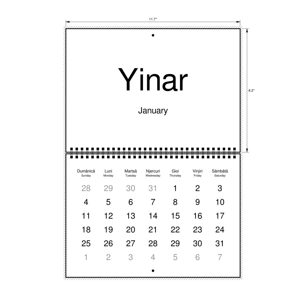 2026 Wall CalendarAromanian/English-Labeled, Sunday-Start Layout, Wire-Bound, 11.7 x 8.3 in (29.7 x 21.0 cm)