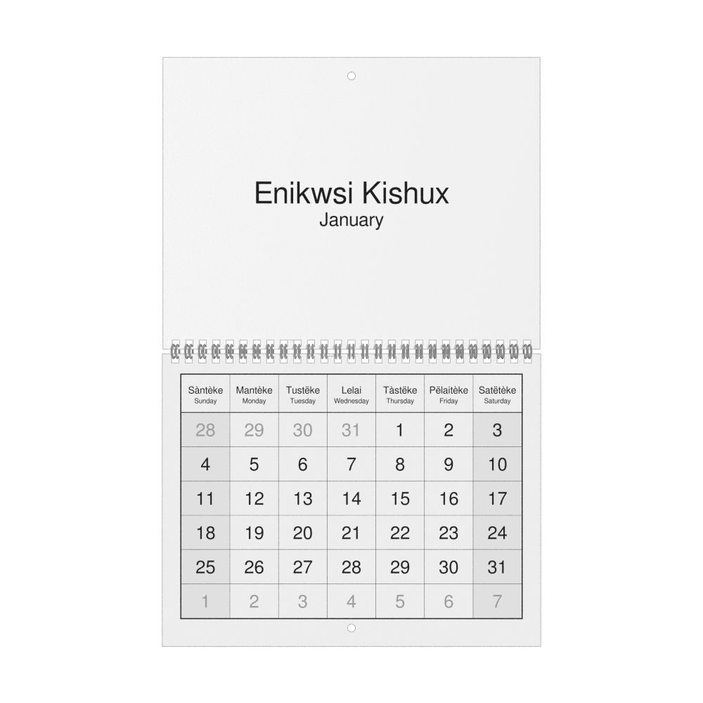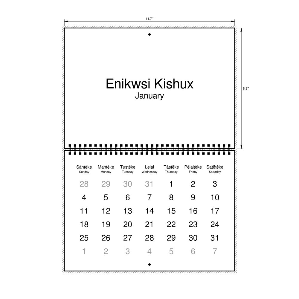An Unami-language wall calendar (2026, Sunday-start format) with English translations.