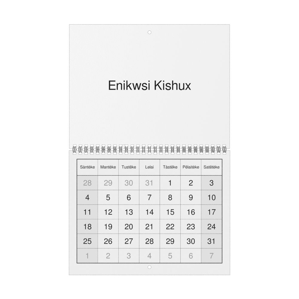 This calendar features the Unami names of months and days of the week on top of a standard Gregorian calendar layout. Beyond its utility for tracking dates, it serves as an educational tool, cultural touchstone (cultural artifact), and functional decor (aesthetic object).