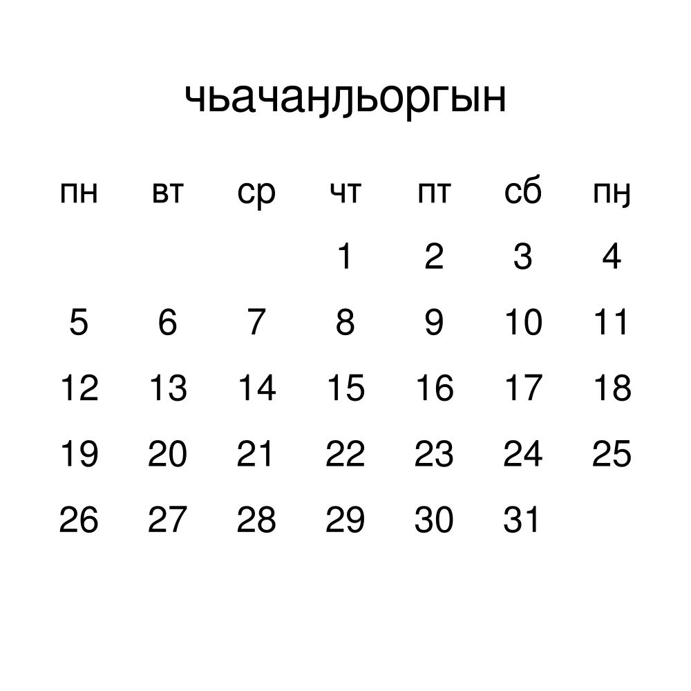 This calendar features the Chukchi names of months and days of the week on top of a standard Gregorian calendar layout. Beyond its utility for tracking dates, it serves as an educational tool, cultural touchstone (cultural artifact), and functional decor (aesthetic object).