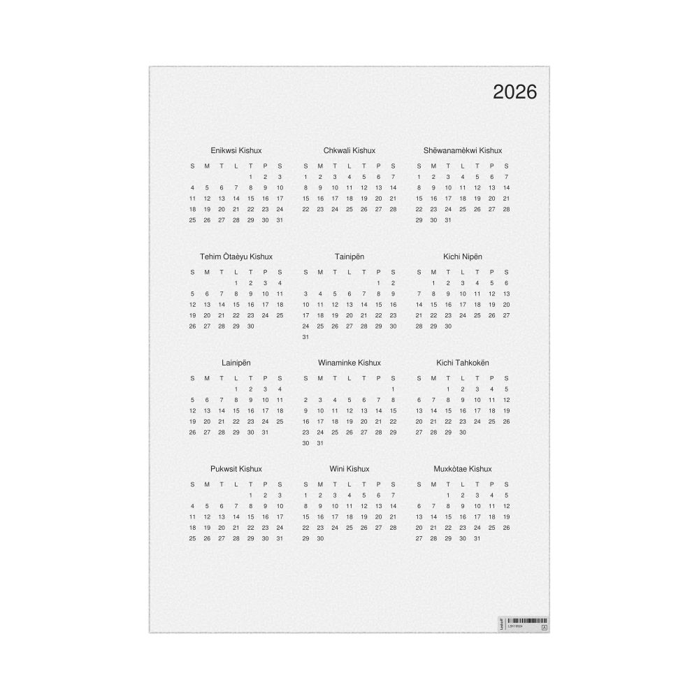 This calendar features the Unami names of months and days of the week on top of a standard Gregorian calendar layout. Beyond its utility for tracking dates, it serves as an educational tool, cultural touchstone (cultural artifact), and functional decor (aesthetic object).