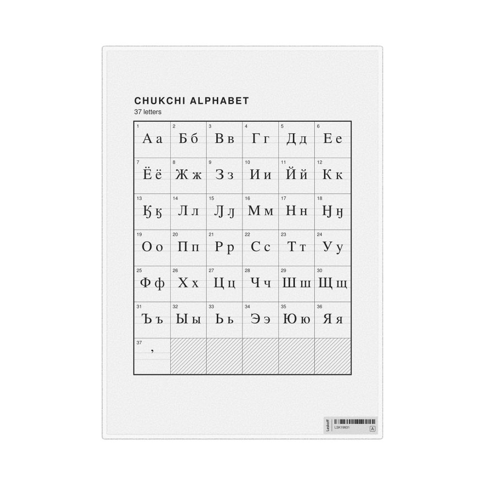 - Linguists and philologists - For both professionals and hobbyists, this alphabet print serves as a piece of linguistic art that presents the character inventory of Chukchi as a linguistic (graphemic) dataset. Add this to your Chukchi collection to complement your studies and research. A mixture of Chukchi letters and English metatext makes it a unique, visually intriguing illustration of linguistic diversity and interaction.