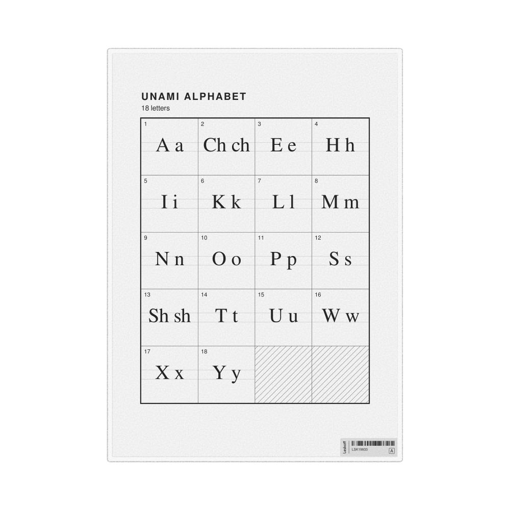 - Linguists and philologists - For both professionals and hobbyists, this alphabet print serves as a piece of linguistic art that presents the character inventory of Unami as a linguistic (graphemic) dataset. Add this to your Unami collection to complement your studies and research. A mixture of Unami letters and English metatext makes it a unique, visually intriguing illustration of linguistic diversity and interaction.