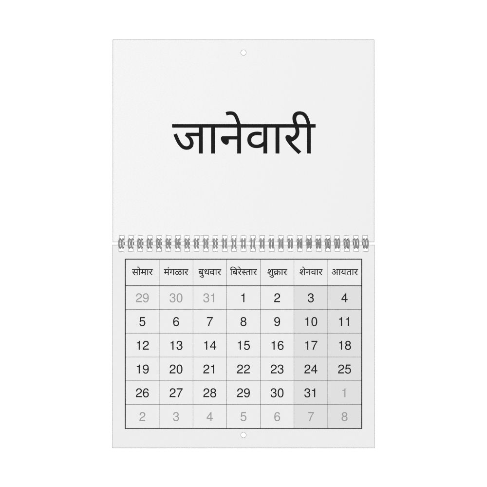 • Linguistics enthusiasts and polyglots - For "language geeks" interested in comparative linguistics or the mechanics of different languages and who value the aesthetic differences in scripts, orthography, and typography of different languages, the Konkani calendar serves as an object of intellectual interest. You can collect calendars for various languages to compare their linguistic roots (e.g., comparing Romance languages vs. Slavic languages). Leskoff's calendars are characterized by specific typographic choices that highlight the orthography and script unique to the target language. Think correct usage of diacritics, characters, and directional writing (left-to-right vs. right-to-left). The minimalist design focuses on legibility and aesthetic appeal of the script itself.