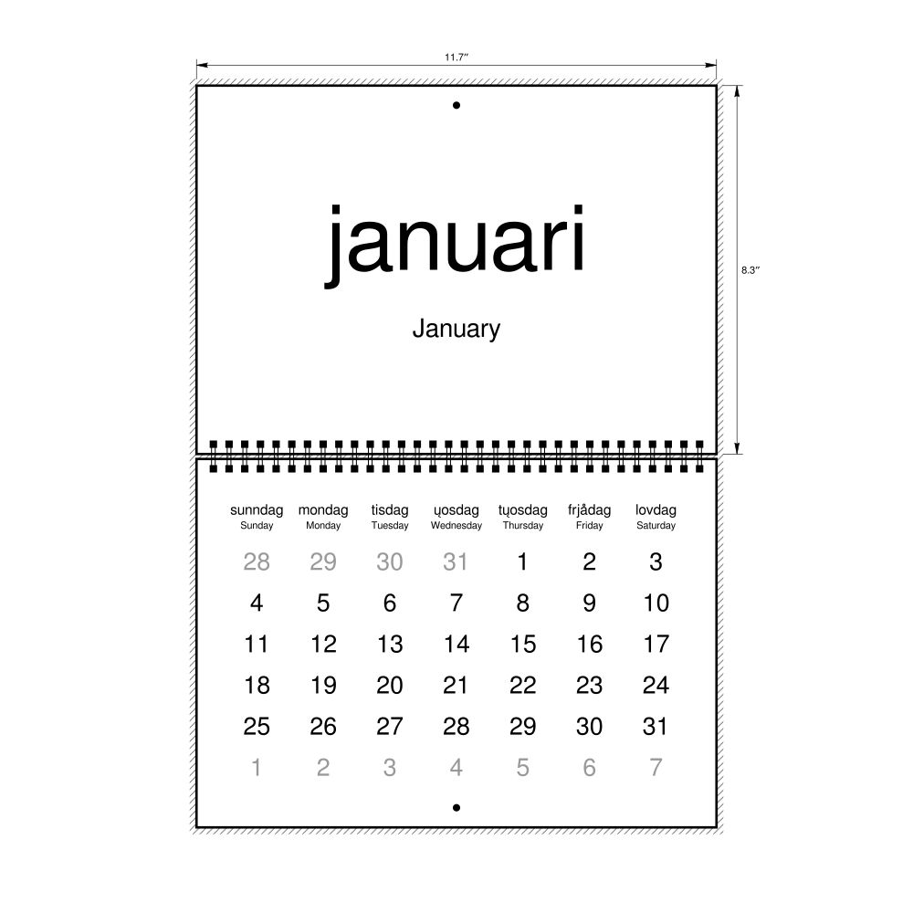 2027 Wall Calendar, Elfdalian-Labeled, Sunday-Start Layout, Wire-Bound, 11.7 x 8.3 in (29.7 x 21.0 cm)