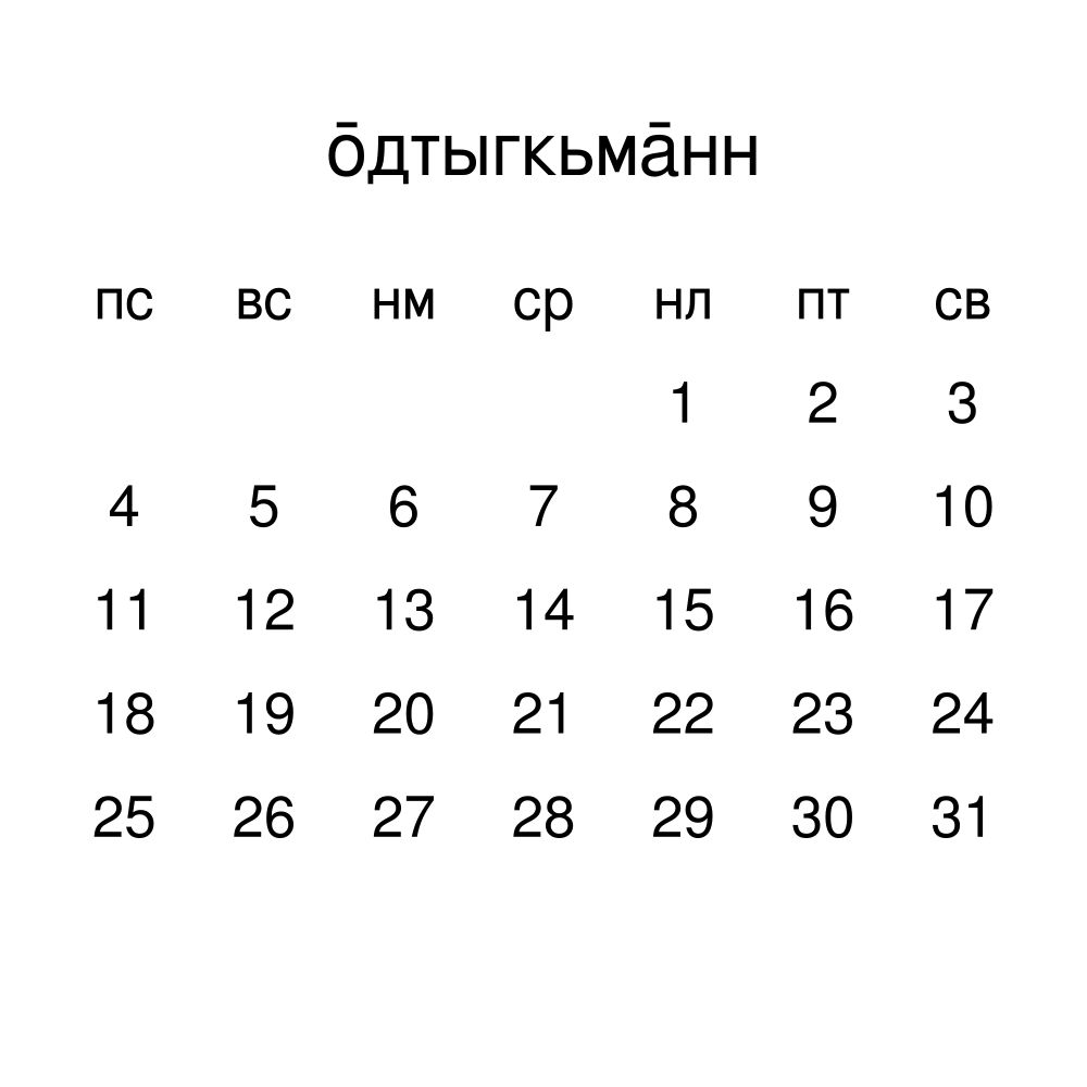 This calendar features the Kildin Sámi names of months and days of the week on top of a standard Gregorian calendar layout. Beyond its utility for tracking dates, it serves as an educational tool, cultural touchstone (cultural artifact), and functional decor (aesthetic object).