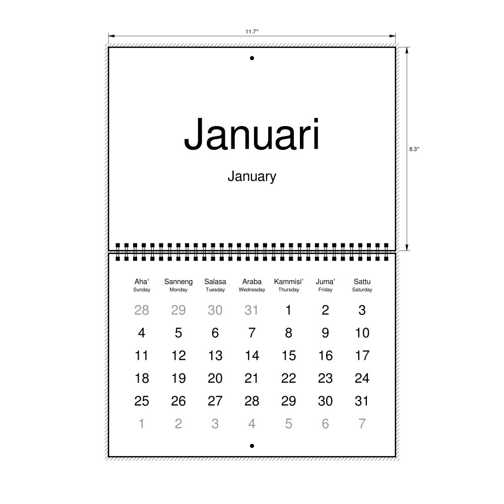 2027 Wall Calendar, Makassarese/English-Labeled, Sunday-Start Layout, Wire-Bound, 11.7 x 8.3 in (29.7 x 21.0 cm)