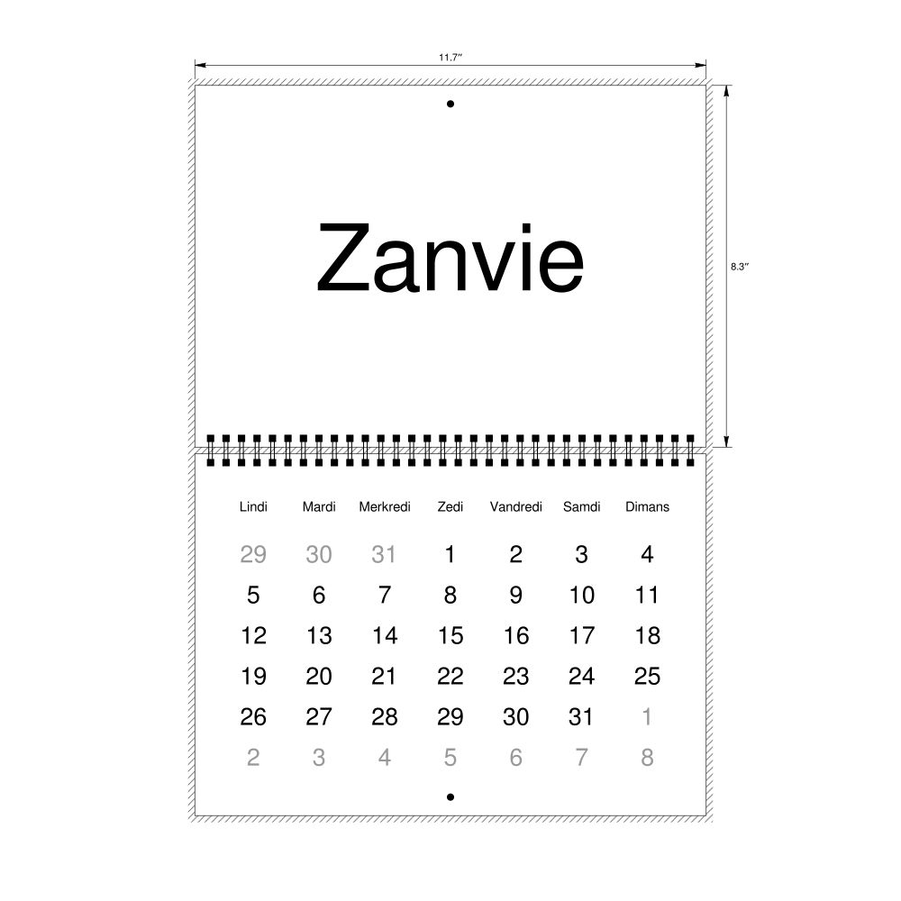 This calendar features the Mauritian Creole names of months and days of the week on top of a standard Gregorian calendar layout. Beyond its utility for tracking dates, it serves as an educational tool, cultural touchstone (cultural artifact), and functional decor (aesthetic object).