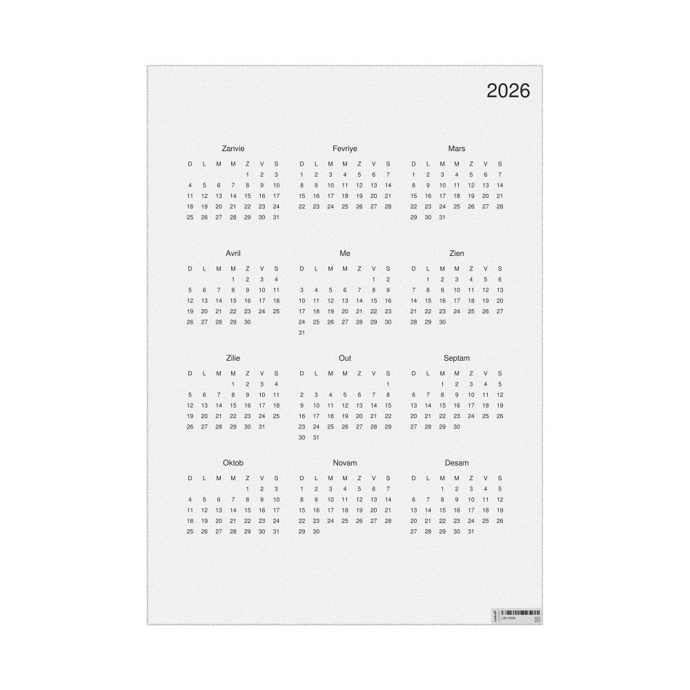 Leskoff 2026 Wall Calendar, Mauritian Creole-Labeled, Sunday-Start Layout, Poster / Wall Print, 23.4 x 33.1 in (59.4 x 84.1 cm), image 1 of 2
