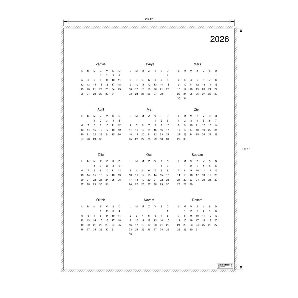 This calendar features the Mauritian Creole names of months and days of the week on top of a standard Gregorian calendar layout. Beyond its utility for tracking dates, it serves as an educational tool, cultural touchstone (cultural artifact), and functional decor (aesthetic object).
