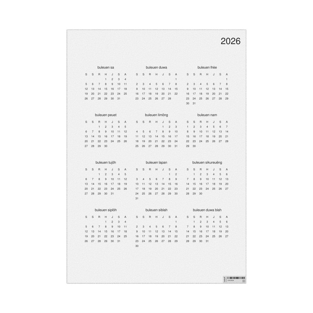 - Linguistics enthusiasts and polyglots - For "language geeks" interested in comparative linguistics or the mechanics of different languages and who value the aesthetic differences in scripts, orthography, and typography of different languages, the Acehnese calendar serves as an object of intellectual interest. You can collect calendars for various languages to compare their linguistic roots (e.g., comparing Romance languages vs. Slavic languages). Leskoff's calendars are characterized by specific typographic choices that highlight the orthography and script unique to the target language. Think correct usage of diacritics, characters, and directional writing (left-to-right vs. right-to-left). The minimalist design focuses on legibility and aesthetic appeal of the script itself.