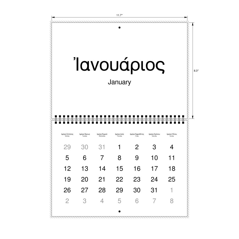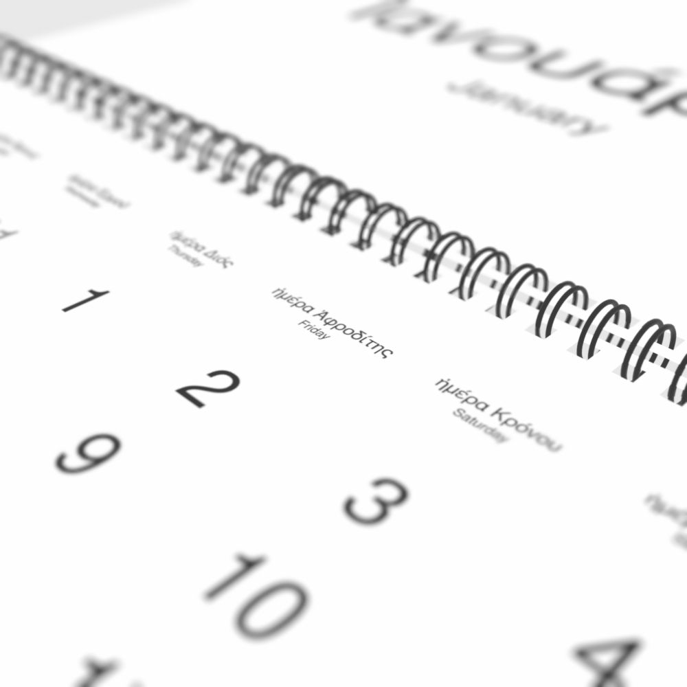 - Polyglots and autodidacts - For "language geeks" interested in the origins of different languages, classical literature, and scholarly pursuits and who value the typographic and aesthetic details of historical languages, the Ancient Greek calendar serves as an object of intellectual interest. You can collect calendars for various languages to compare their linguistic roots. The minimalist design focuses on legibility and aesthetic appeal of the historic and reconstructed words themselves.