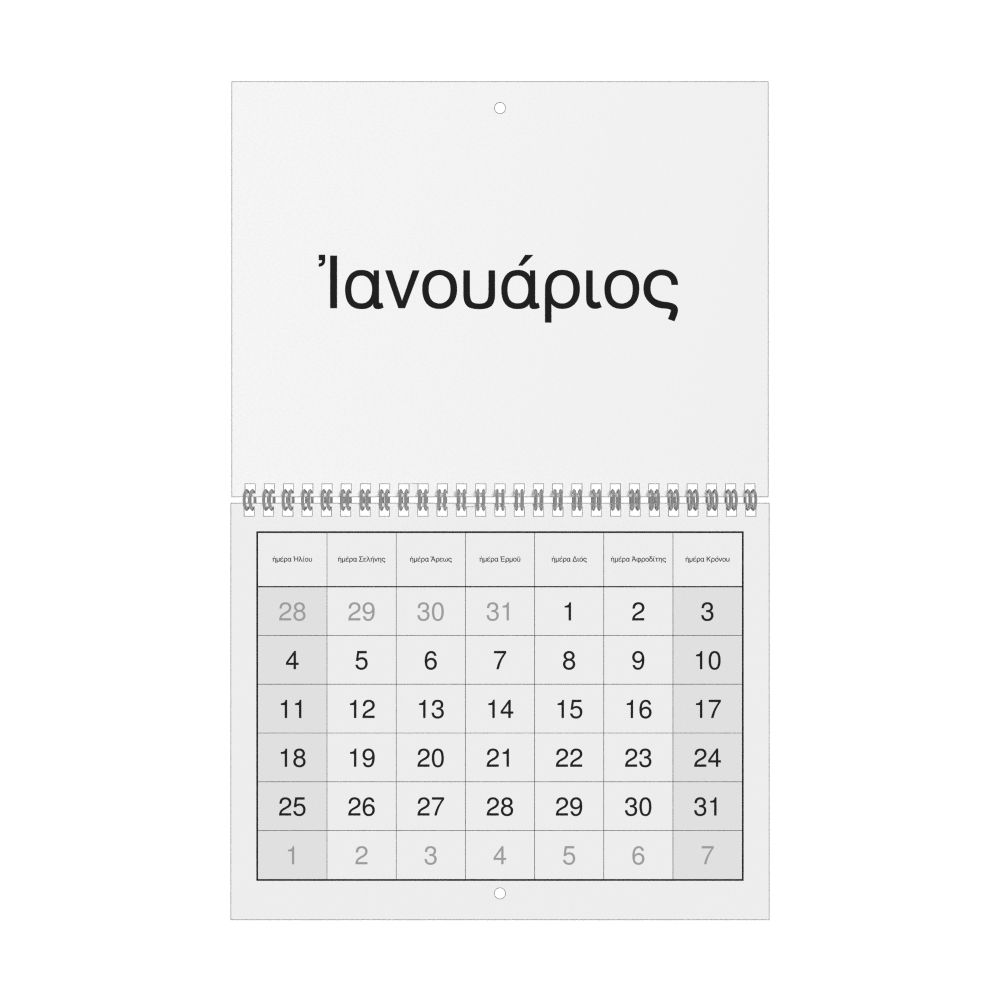 This calendar features the names of months and days of the week in Ancient Greek on top of a modern, standard Gregorian calendar layout. Beyond its utility for tracking dates, it serves as an educational tool and functional decor (aesthetic object).