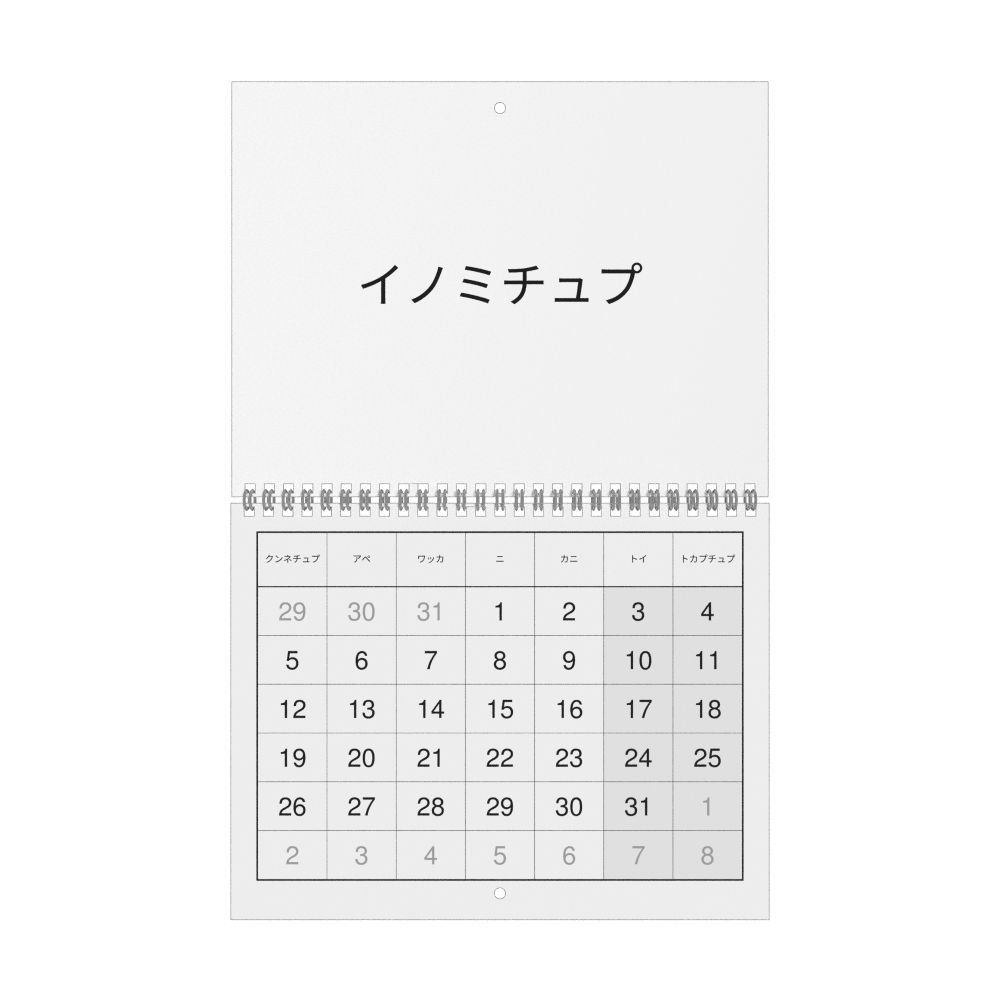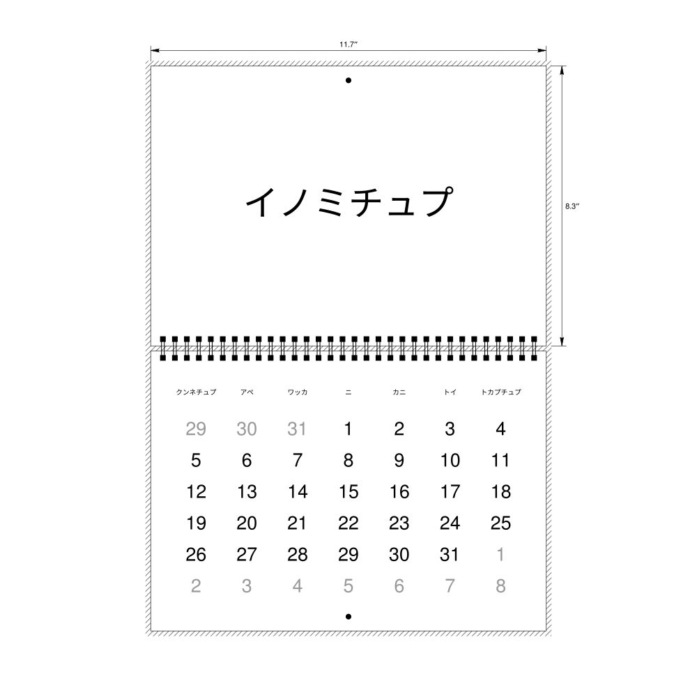 This calendar features the Ainu names of months and days of the week on top of a standard Gregorian calendar layout. Beyond its utility for tracking dates, it serves as an educational tool, cultural touchstone (cultural artifact), and functional decor (aesthetic object).