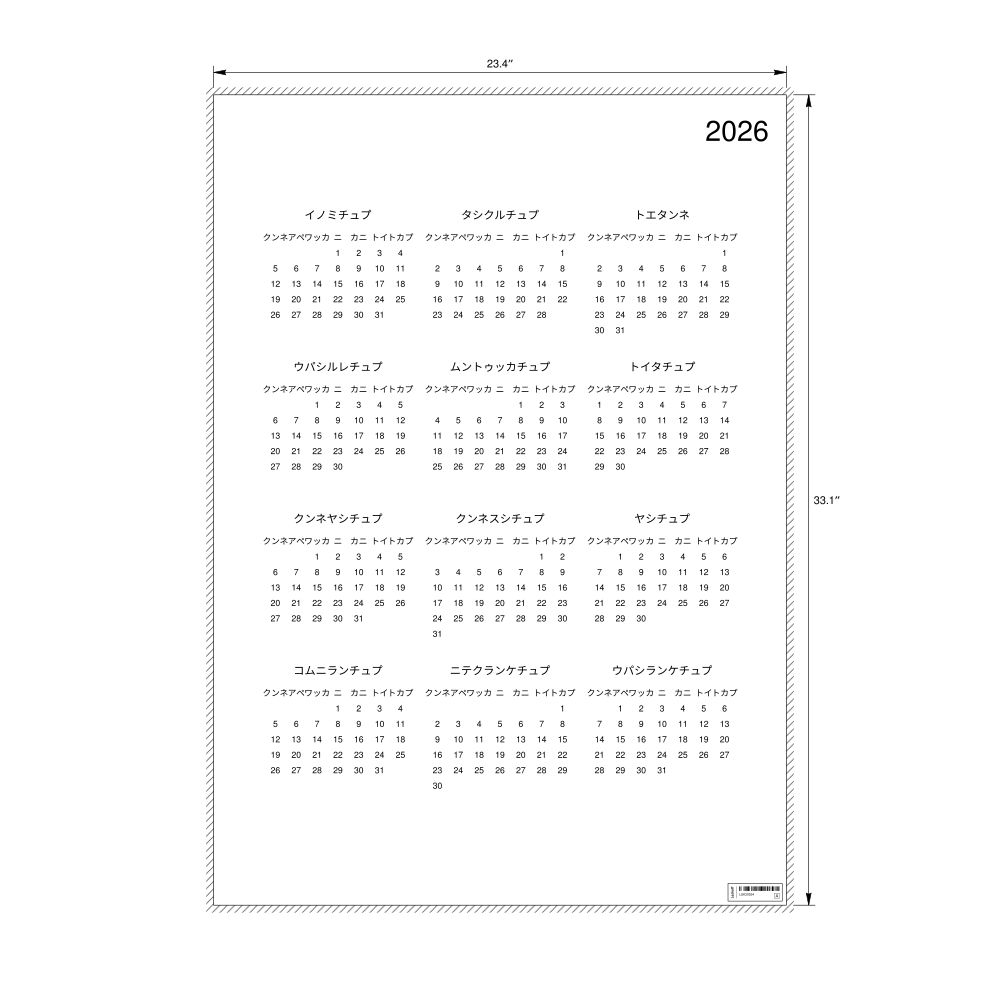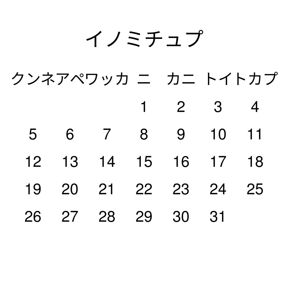 This calendar features the Ainu names of months and days of the week on top of a standard Gregorian calendar layout. Beyond its utility for tracking dates, it serves as an educational tool, cultural touchstone (cultural artifact), and functional decor (aesthetic object).