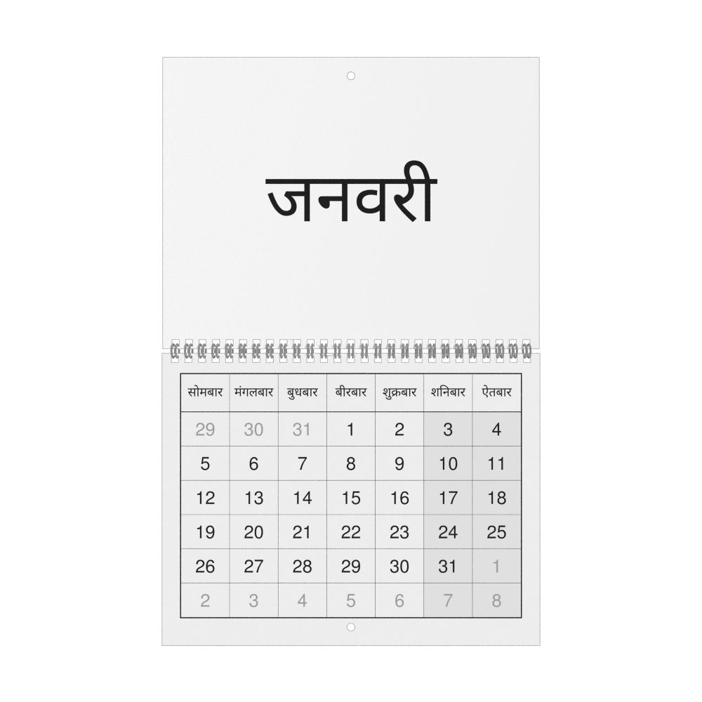 • Dogri language learners and students - For individuals currently studying Dogri, this calendar acts as a tool for passive learning and vocabulary reinforcement. It integrates essential Dogri vocabulary into a daily visual environment and promotes retention through passive immersion and spaced repetition. Place it above a desk or study area to support immersion techniques.