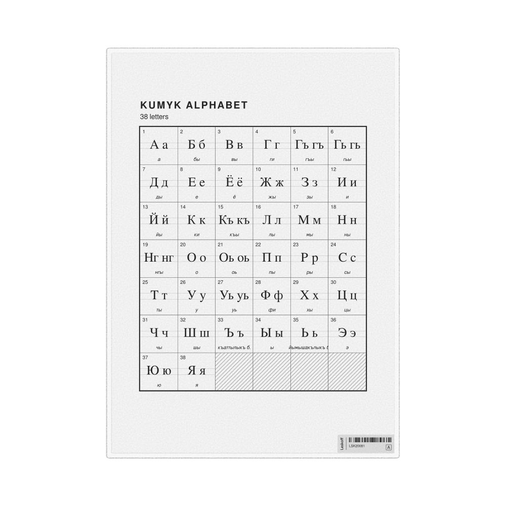 - Linguists and philologists - For both professionals and hobbyists, this alphabet print serves as a piece of linguistic art that presents the character inventory of Kumyk as a linguistic (graphemic) dataset. Add this to your Kumyk collection to complement your studies and research. A mixture of Kumyk letters and English metatext makes it a unique, visually intriguing illustration of linguistic diversity and interaction.