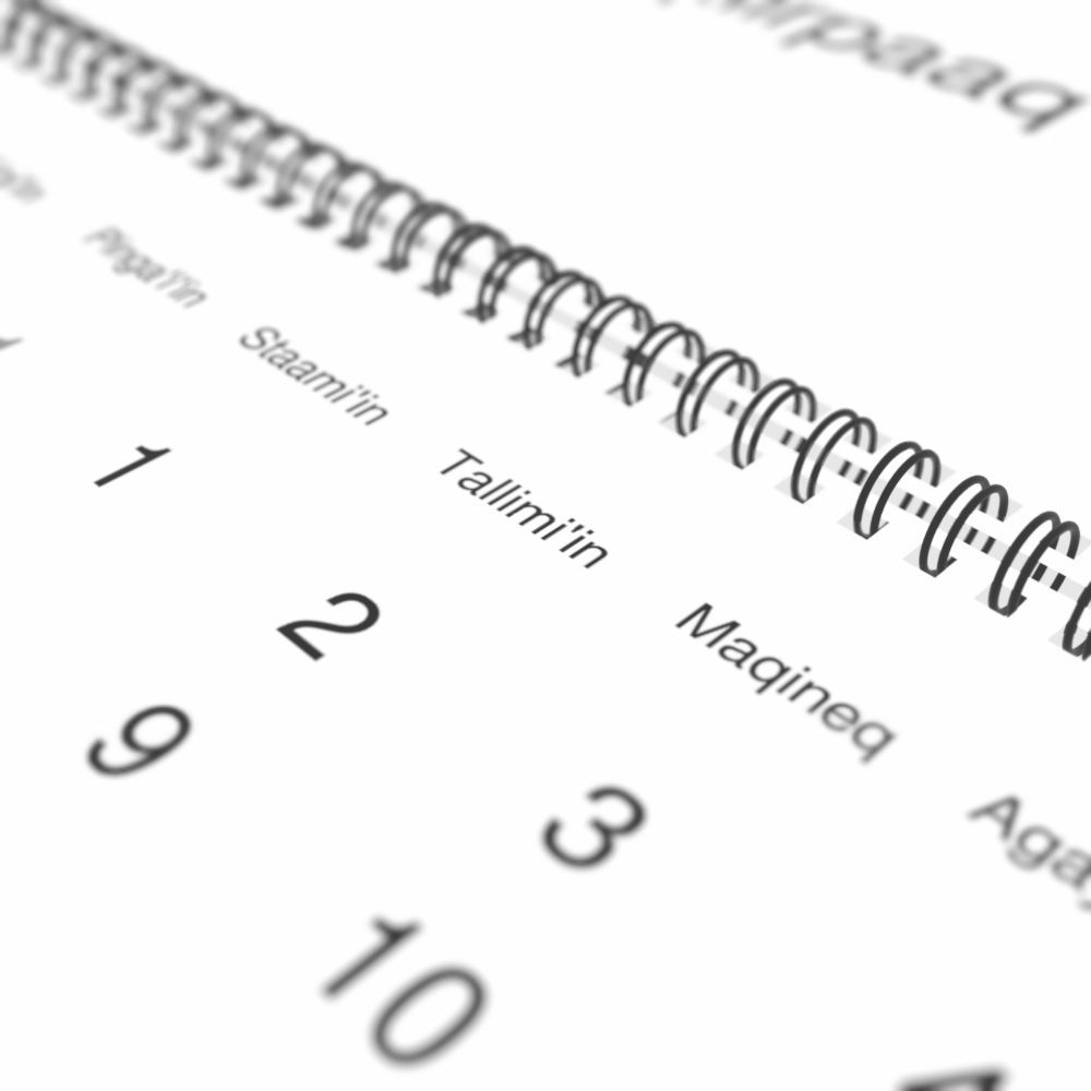 - Alutiiq heritage speakers and cultural connectors - For individuals seeking to maintain a connection to their history, ancestral roots, or the culture associated with the Alutiiq language, the calendar serves as a daily cultural marker. Use it in your home, office, library, or museum as a link to linguistic and cultural identity that integrates Alutiiq into your everyday life. Familiar language script and naming conventions may also provide a sense of home in a foreign environment.