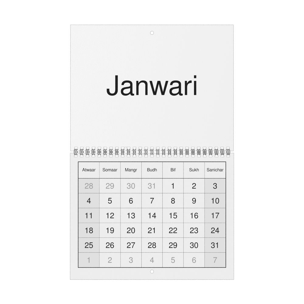 • Linguistics enthusiasts and polyglots - For "language geeks" interested in comparative linguistics or the mechanics of different languages and who value the aesthetic differences in scripts, orthography, and typography of different languages, the Fiji Hindi calendar serves as an object of intellectual interest. You can collect calendars for various languages to compare their linguistic roots (e.g., comparing Romance languages vs. Slavic languages). Leskoff's calendars are characterized by specific typographic choices that highlight the orthography and script unique to the target language. Think correct usage of diacritics, characters, and directional writing (left-to-right vs. right-to-left). The minimalist design focuses on legibility and aesthetic appeal of the script itself.