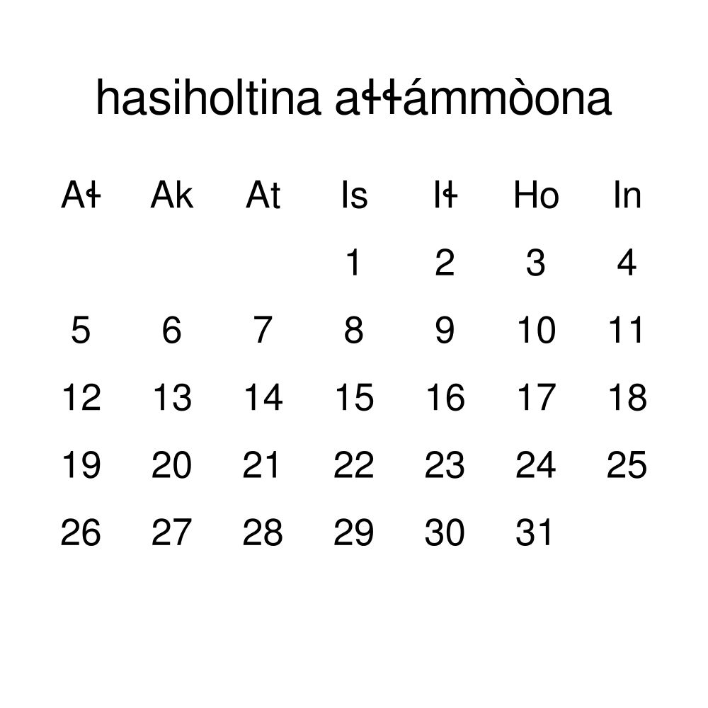 - Alabama speakers and enthusiasts - Choose this calendar if you are looking for a simple, localized calendar in the Alabama language. Use it in your home, office, or classroom as a regular calendar.