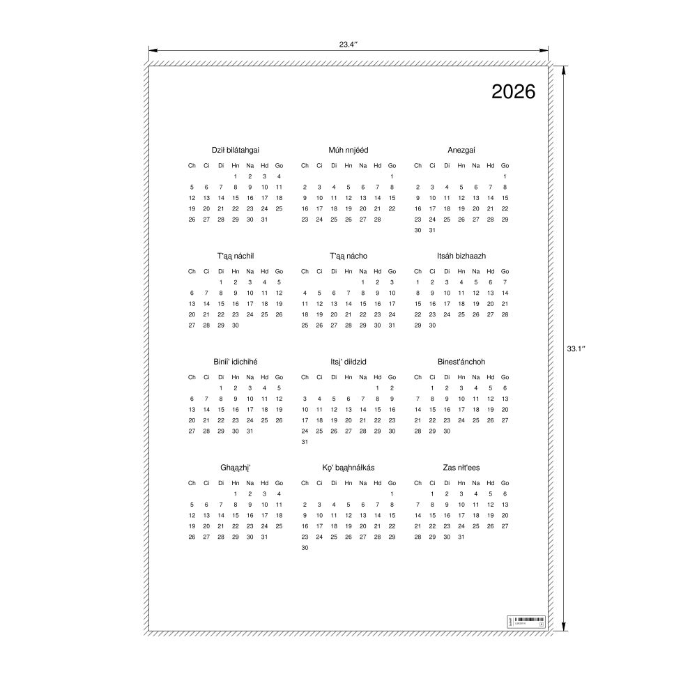 A 2026 wall calendar in Western Apache. The calendar uses the Monday-start week format (common in the UK and Europe).