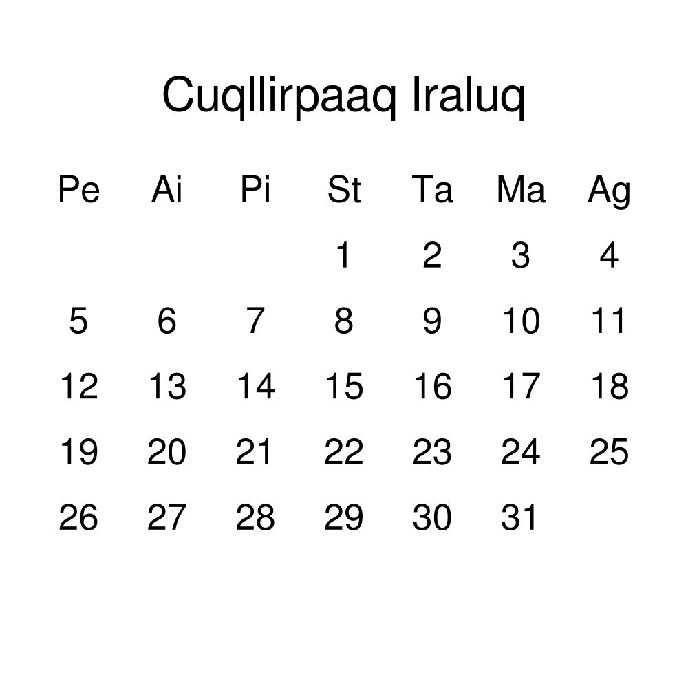 This calendar features the Alutiiq names of months and days of the week on top of a standard Gregorian calendar layout. Beyond its utility for tracking dates, it serves as an educational tool, cultural touchstone (cultural artifact), and functional decor (aesthetic object).