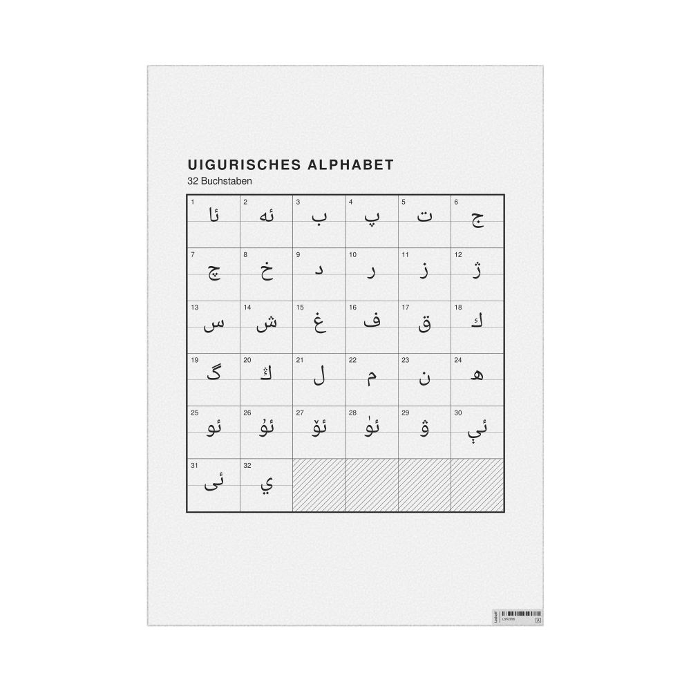 - Linguists and philologists - For both professionals and hobbyists, this alphabet print serves as a piece of linguistic art that presents the character inventory of Uyghur as a linguistic (graphemic) dataset. Add this to your Uyghur collection to complement your studies and research. A mixture of Uyghur letters and German metatext makes it a unique, visually intriguing illustration of linguistic diversity and interaction.