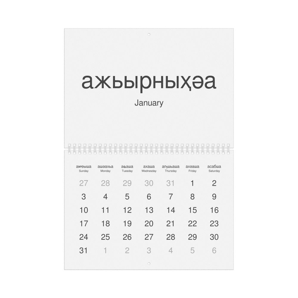 2027 Wall Calendar, Abkhaz/English-Labeled, Monday-Start Layout, Wire-Bound, 11.7 x 8.3 in (29.7 x 21.0 cm)