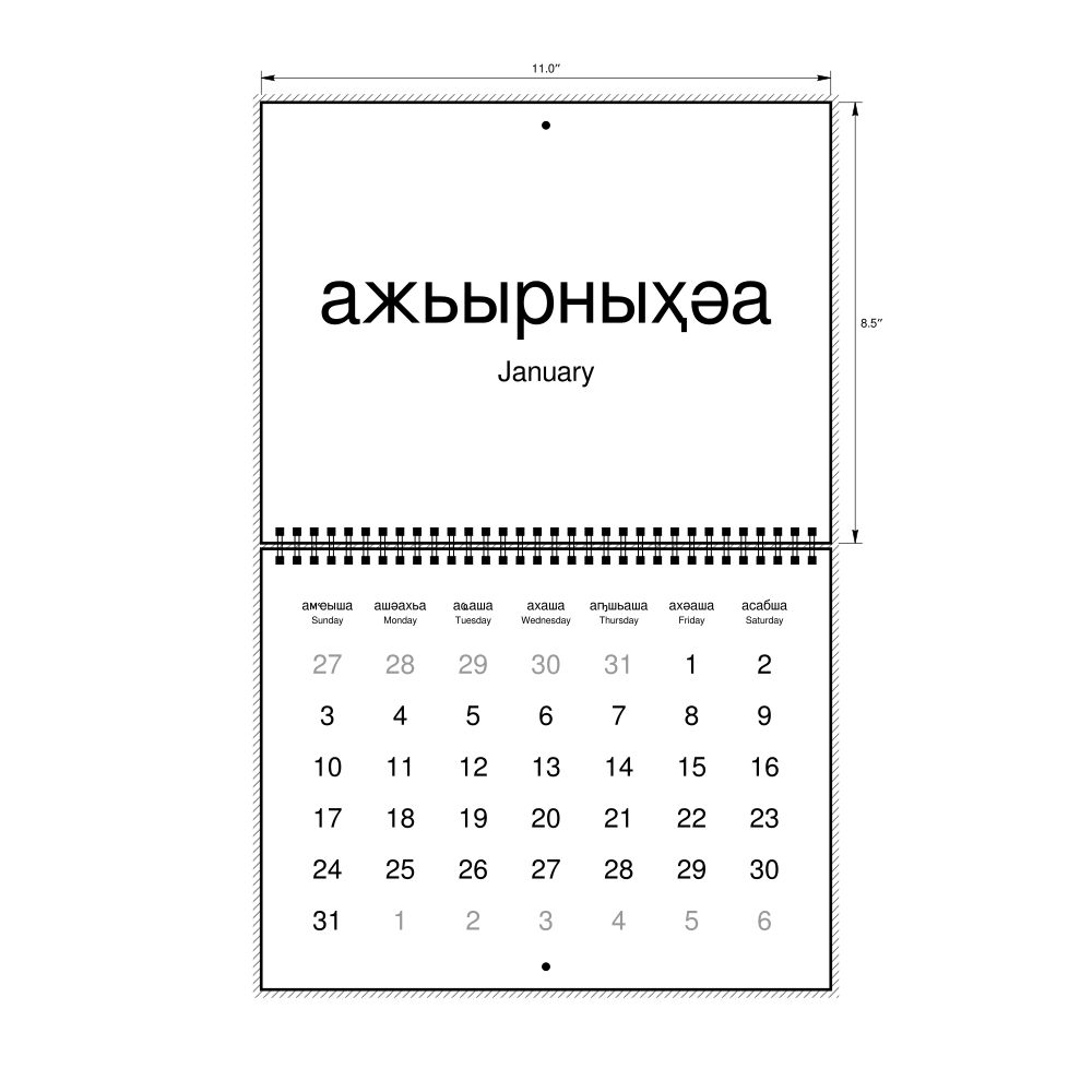 2027 Wall Calendar, Abkhaz-Labeled, Sunday-Start Layout, Wire-Bound, 11 x 8.5 in (27.9 x 21.6 cm)