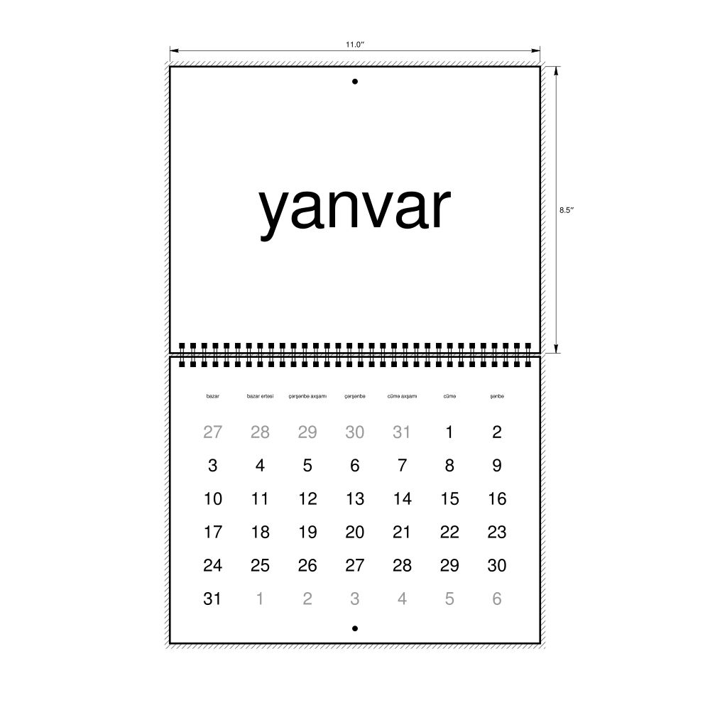 2027 Wall Calendar, Azerbaijani-Labeled, Sunday-Start Layout, Wire-Bound, 11 x 8.5 in (27.9 x 21.6 cm)
