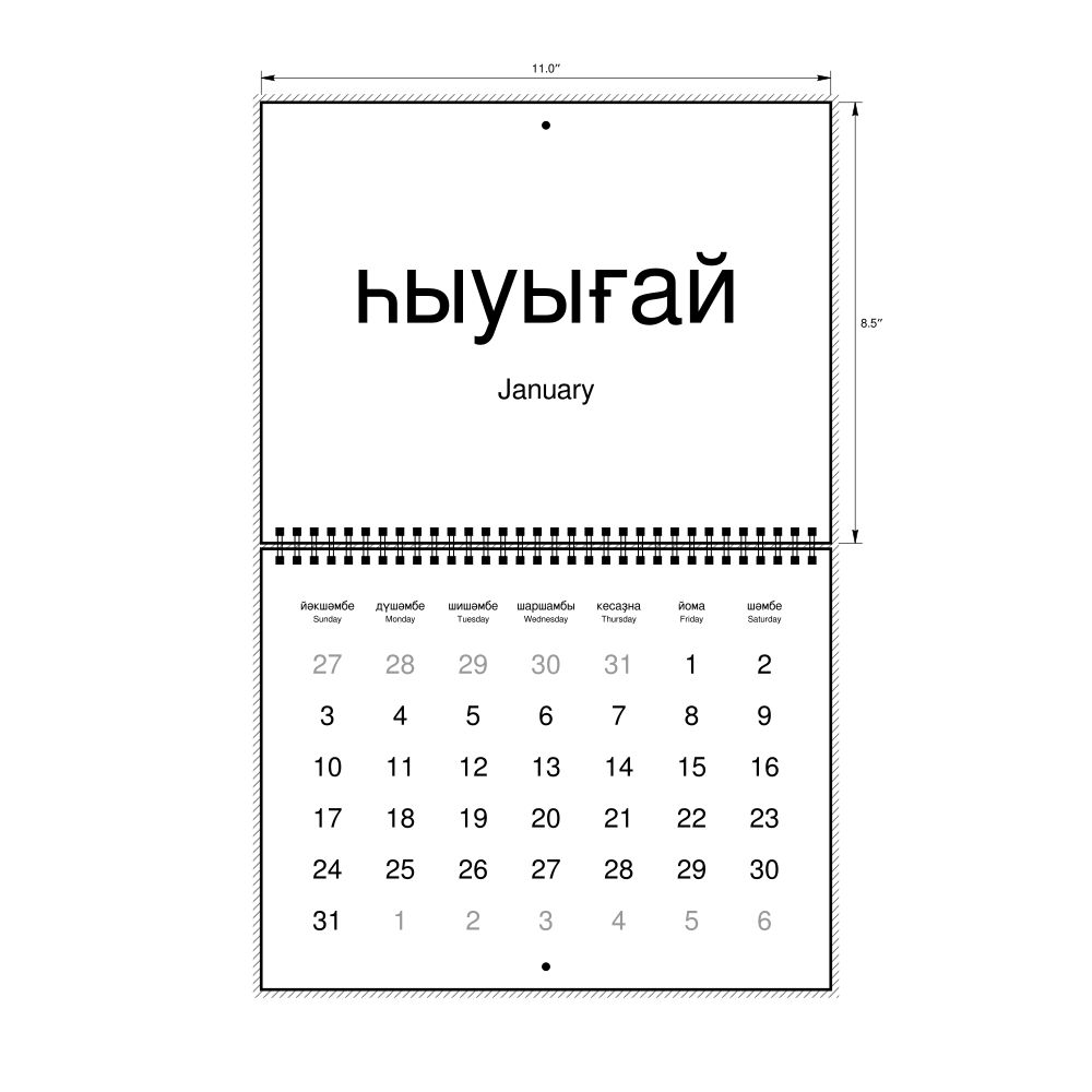 2027 Wall CalendarBashkir/English-Labeled, Sunday-Start Layout, Wire-Bound, 11 x 8.5 in (27.9 x 21.6 cm)