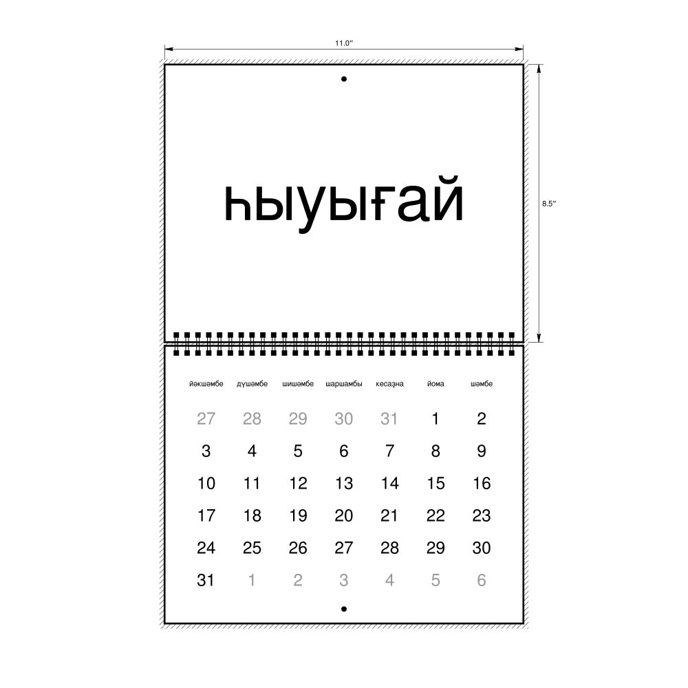 • Linguistics enthusiasts and polyglots - For "language geeks" interested in comparative linguistics or the mechanics of different languages and who value the aesthetic differences in scripts, orthography, and typography of different languages, the Bashkir calendar serves as an object of intellectual interest. You can collect calendars for various languages to compare their linguistic roots (e.g., comparing Romance languages vs. Slavic languages). Leskoff's calendars are characterized by specific typographic choices that highlight the orthography and script unique to the target language. Think correct usage of diacritics, characters, and directional writing (left-to-right vs. right-to-left). The minimalist design focuses on legibility and aesthetic appeal of the script itself.