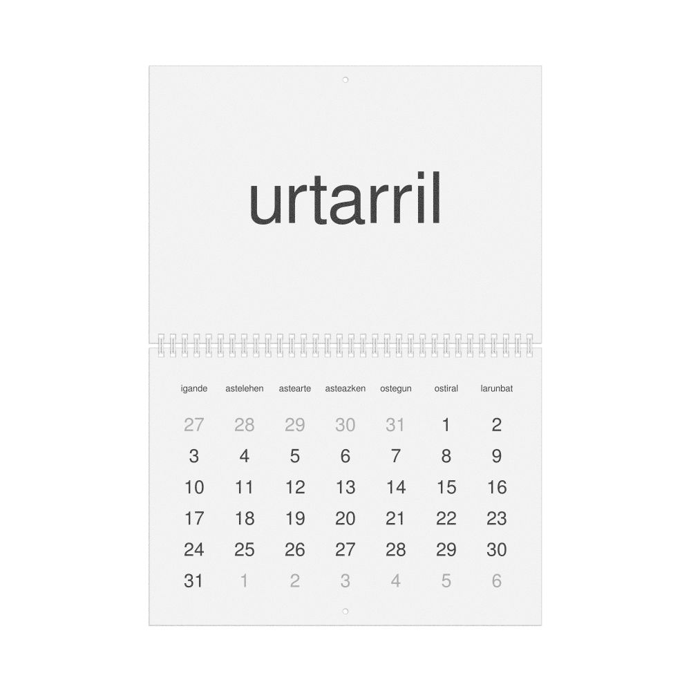 This calendar features the Basque names of months and days of the week on top of a standard Gregorian calendar layout. Beyond its utility for tracking dates, it serves as an educational tool, cultural touchstone (cultural artifact), and functional decor (aesthetic object).