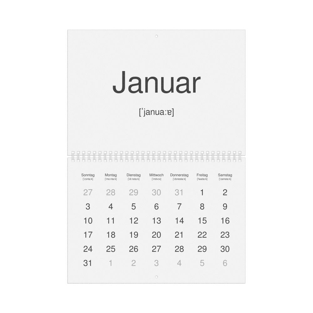 2026 Phonetic Wall Calendar, German-Labeled with IPA, Sunday-Start Layout, Wire-Bound, 11.7 x 8.3 in (29.7 x 21.0 cm)