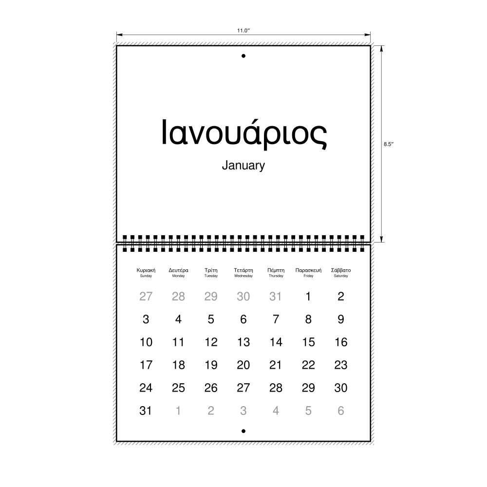 2026 Wall Calendar, Greek-Labeled, Monday-Start Layout, Wire-Bound, 11 x 8.5 in (27.9 x 21.6 cm)