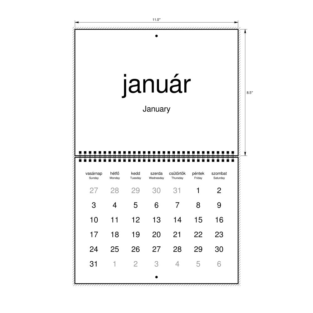 2027 Wall CalendarHungarian/English-Labeled, Sunday-Start Layout, Wire-Bound, 11 x 8.5 in (27.9 x 21.6 cm)