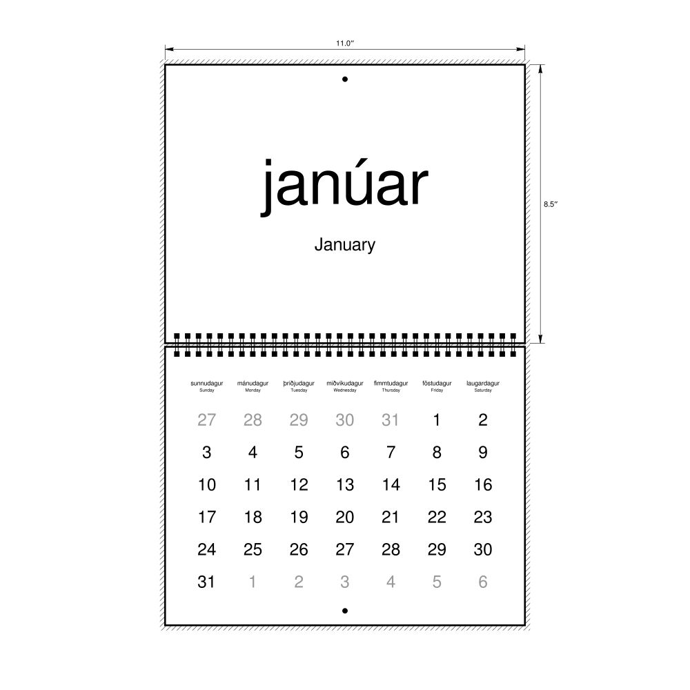2027 Wall CalendarIcelandic/English-Labeled, Sunday-Start Layout, Wire-Bound, 11 x 8.5 in (27.9 x 21.6 cm)