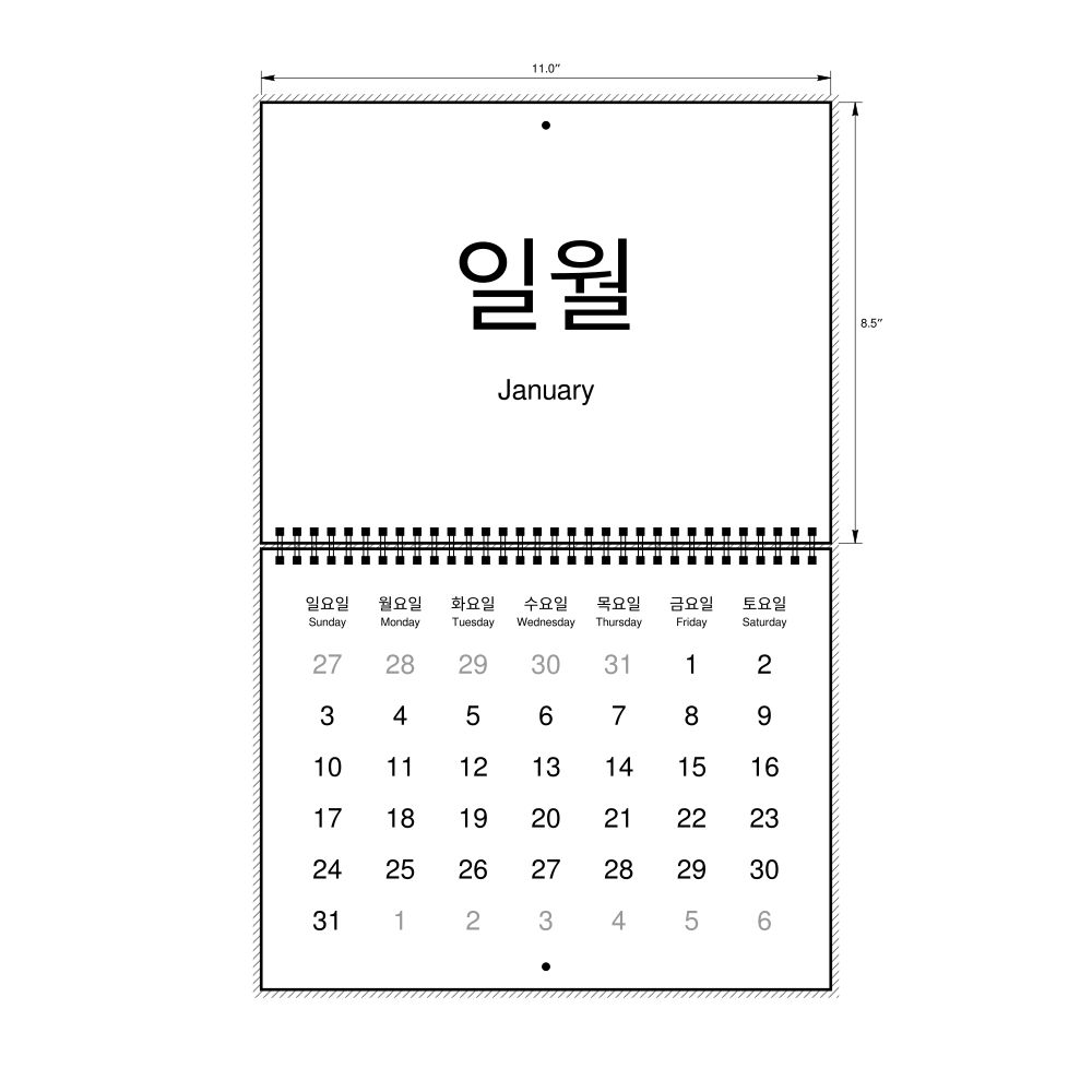 2027 Wall CalendarKorean/English-Labeled, Sunday-Start Layout, Wire-Bound, 11 x 8.5 in (27.9 x 21.6 cm)